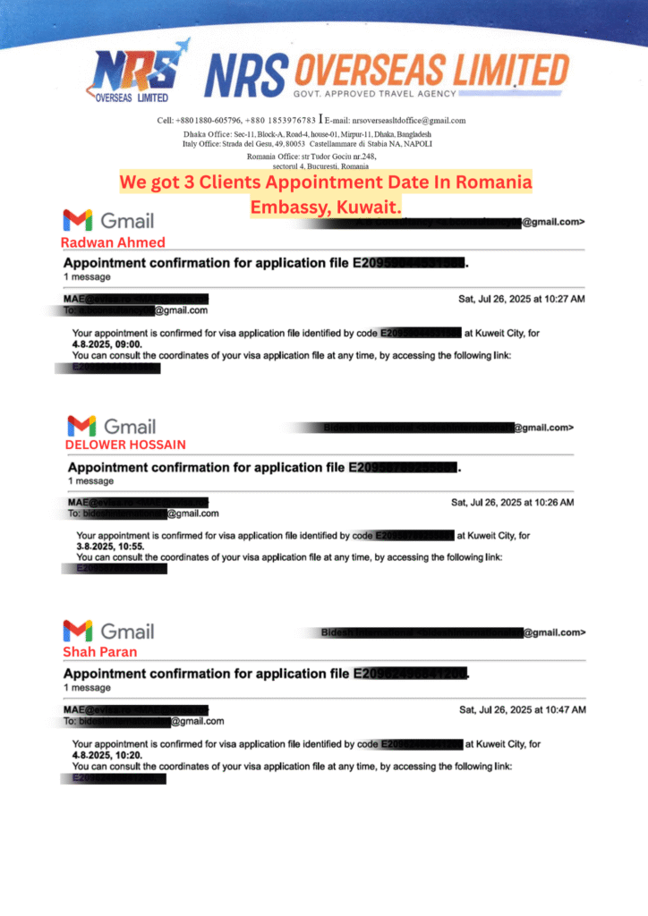 Alhamdulillah , We have successfully scheduled visa appointments at the Romanian Embassy in Kuwait for three Clients.”